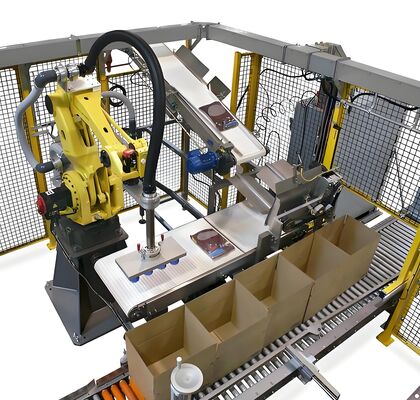 このシステムは、段ボール箱、ワインボトル、金属缶、プラスチック容器の自動包装用に設計されています。製品選別ライン、2軸ロボット、フレーム、治具、メインコントロールキャビネットで構成されています。カートン成形機、カートンシーラー、パレタイザーとシームレスに統合して、完全自動化された生産ラインを構築できます。